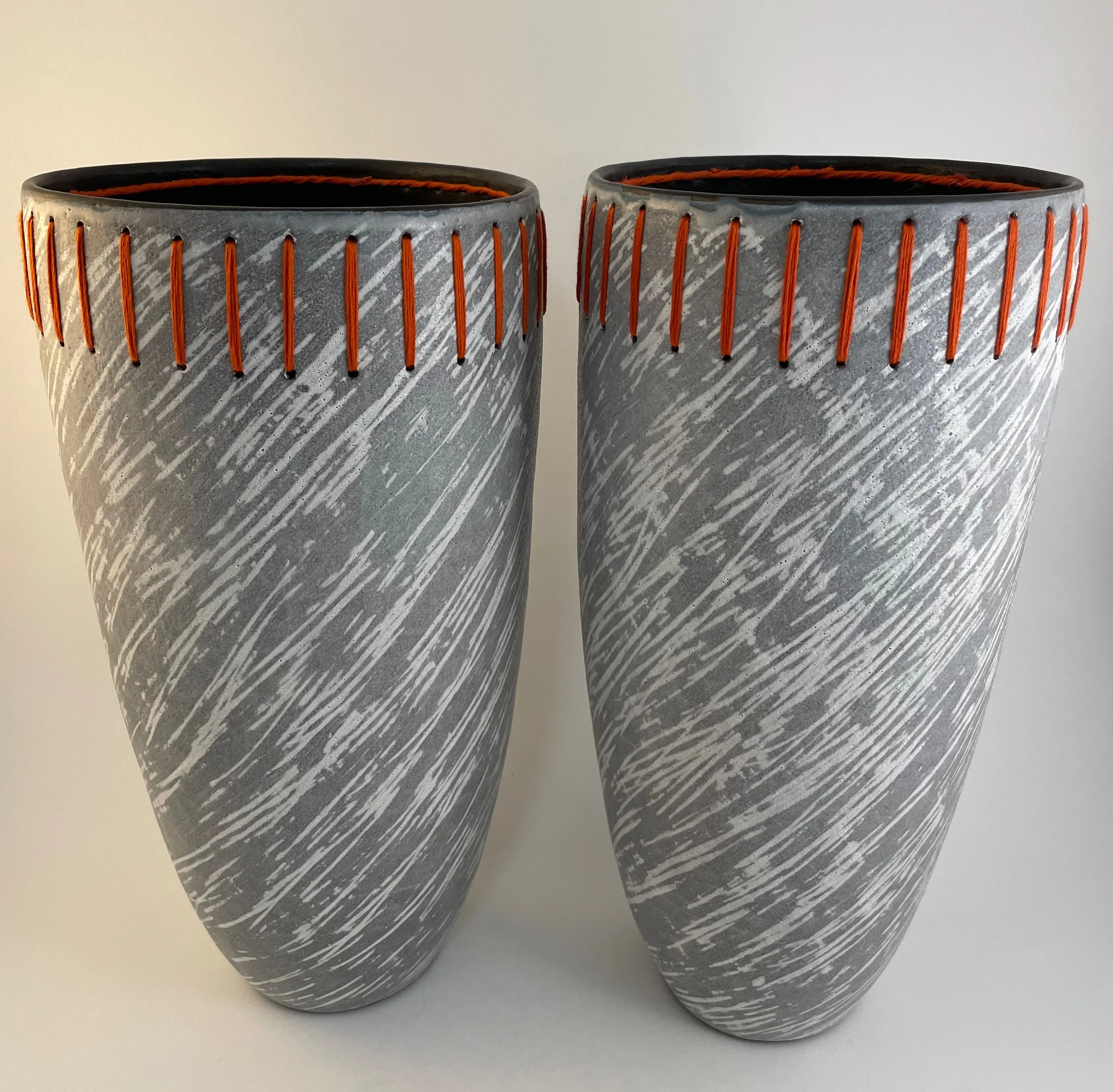 2024, 33 x 16 x 16 cm, 2x Coil Built, orange embroidered, cone 6 vessels.