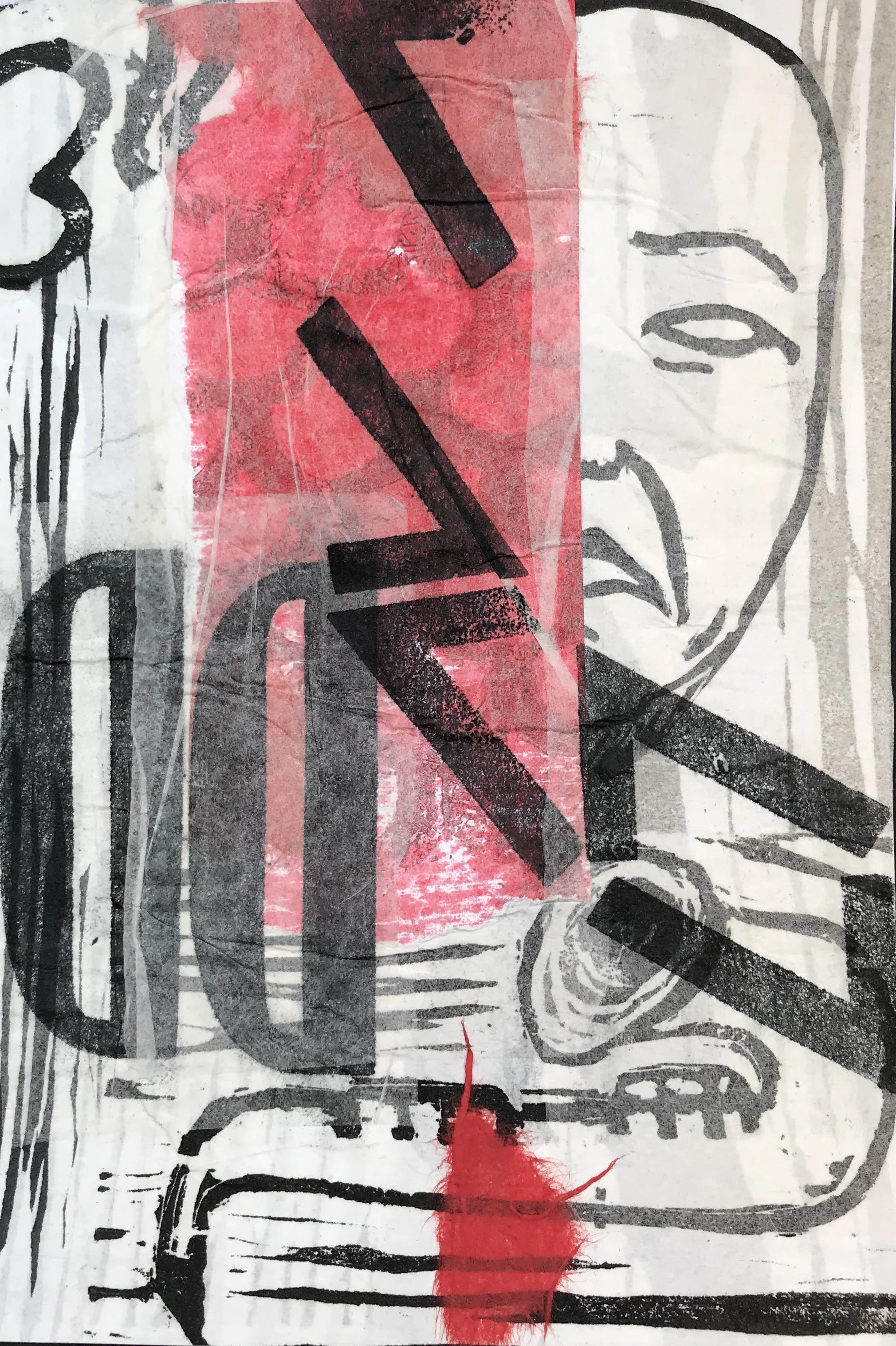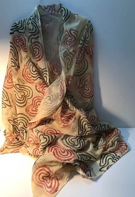 I am a printmaker and my prints are mostly: woodblock, linocut, and monotype prints. I love exploring processes, techniques, combining print methods and discovering new pathways. Printmaking embraces the element of surprise. Even in an edition of relief prints each is original and unique. Besides editions I enjoy mixed media prints that use collage and mark making along with monotype or relief. As well, I have been printing onto textiles for the last few years and I have some wearable art and accessories to offer this Art Walk.