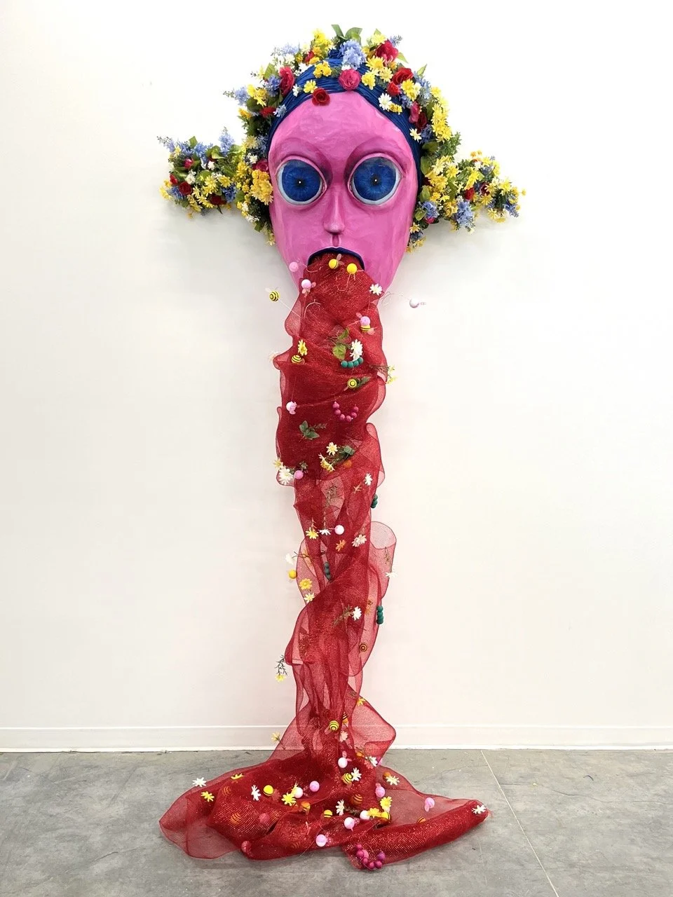 2024, 108” x 60” (approx.), Acrylic paint, acrylic pen, aluminum foil, aluminum wire, chicken wire, lamination paper, papier-mâché, plastic flowers, red mesh ribbon, Styrofoam balls, trellis netting, wooden beads, wool.