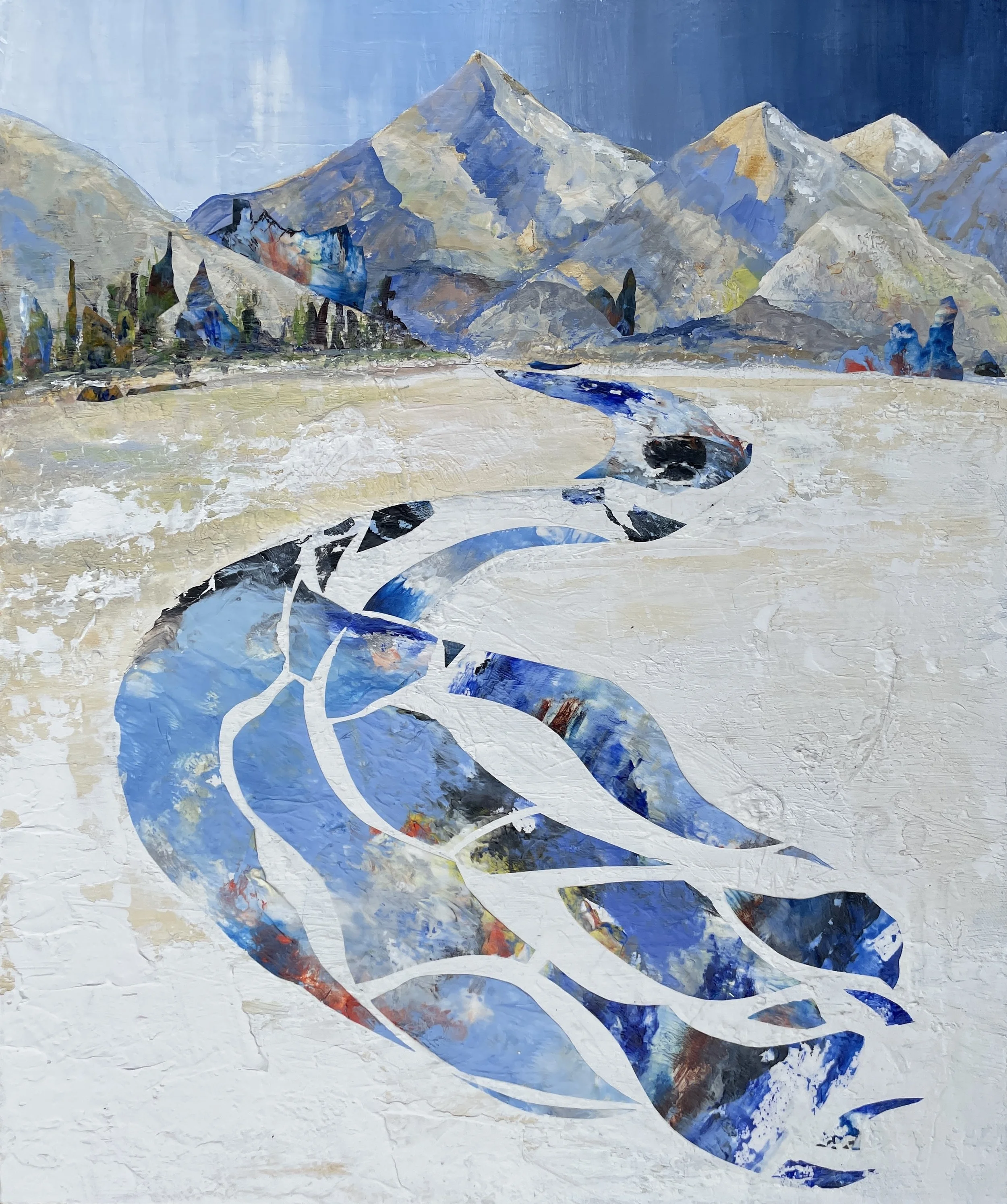 The use of acrylic collage creates a new dimension, allowing negative spaces to suggest the fluidity of elements, the flow of water, the movement of fish or the flights of birds. Salmon represent all that is beautiful in British Columbia. My paintings are designed to remind all of us, of our debt of allegiance to the natural world.